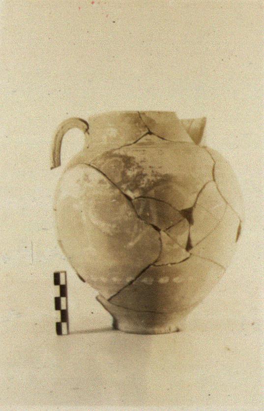 | Description: | Mended from many fragments; pieces of lip, body and handle missing. Shape as P 9892 (Φ 294). Around the pot, in large white letters (faded), starting and ending at handle: <graphic> Reddish to brown glaze, badly fired, worn off in places. ADDENDA Handle missing. | |