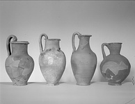 | Description: | Intact, save minor fractures. Spreading ring foot; elongated body; narrow neck; round mouth, somewhat flattened at handle; grooved handle. Irregular ribbing on body. Pinkish clay and slip. ADDENDA Mouth and neck later broken; fragment missing. | |