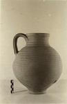 | Description: | Fragment of lip missing; otherwise intact. Ring foot; round mouth; grooved handle. Ribbing on neck and body except toward bottom. Pinkish clay. Orange slip. Stuck to bottom inside, a coin. ADDENDA Coin extracted (Oct. 1951) and inventoried as coin no. 32, 7 April 1937 (= Φ-234). | |