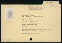 | Description: | Intact. Rather roughly made. Flat bottom; plain flaring lip. Ribbing on body. Pinkish clay. Buff slip. | |