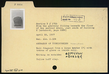 | Description: | Wall fragment from a large krater(?) with traces of glaze on inside only. Yellow buff clay. Writing on outside: <graphic> | |