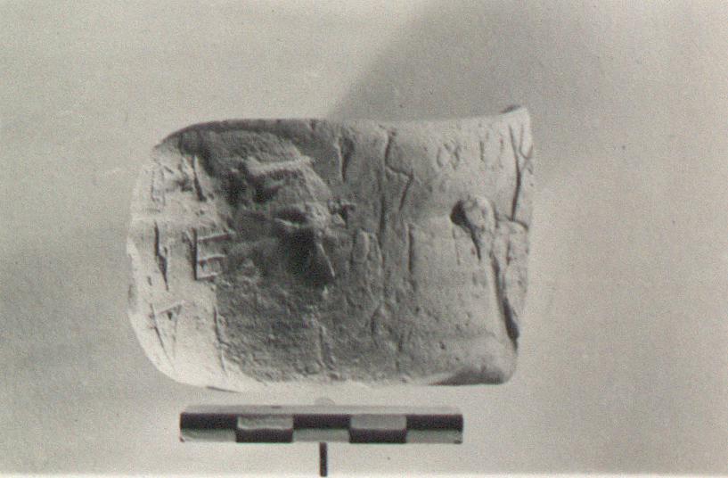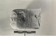 | Description: | Handle from a large plain jar; flat in section. Pinkish buff clay. Writing on outside; surface damaged: <graphic> | |