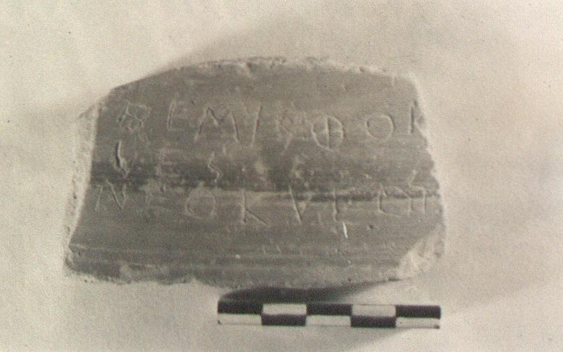 | Description: | Wall fragment from large pot (partly glazed krater); red glaze on inside, thin red wash on outside. Writing on outside: <graphic> | |