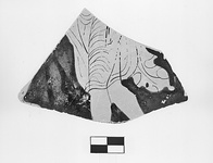 | Description: | Wall fragment. Much of the lower part of a figure dancing left, wearing a short loose garment which reaches to just above the knees. Bit of some other object at lower left. No relief contours. | |