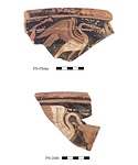 | Description: | Two rim fragments from a 'double decker' krater, shape as Louvre, Pottier, Album, III, G 529,530 Battle of Pygmies and Cranes: on a) a crane, right, between two pygmies the one at the left with a club right raised hand and other at the right, object between him and the crane is probably his dropped club (?); on b) a crane, right, grasping with his beak the outstretched, drapery covered arm of a pygmy. No relief contour; white, with yellow details for parts of the cranes; glaze inside reddish brown; outside grey to black, poor, chipped. | |
