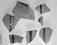 | Description: | Wall fragment; inside unglazed. Preserved is part of a column, and to the left of it, in thin brown, the inscription: ΡΑΤΕ Timokrates, archon 364/3 BC Nikokrates, 333/2 BC | |