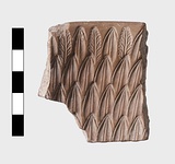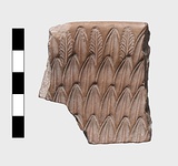 | Description: | Clay: fine, buff, very slightly micaceous, retaining on it's inner surface an oily film. Three fragments, one from the lip, two from the wall. Rim: plain. Wall: Covered with overlapping bracts, with which fronds alternate in the top row. | |