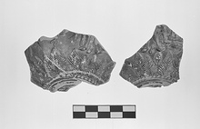 | Description: | Leaf calyx, figured scene with Erotes. Part of medallion and lower wall preserved. Medallion: Around the triple (?) rosette runs a very light ridge and row of beading. Calyx: Two rows of sharp-pointed leaves. Wall: Erotes flying towards two figures (Herakles and Auge ?) of which the lower part of the legs is only preserved. Clay: Pale, pinkish buff. Glaze: Firm black glaze, fired brown inside, worn outside. | |