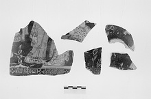 | Description: | a) Parts of three figures: at the right, a woman wearing embroidered chiton and himation is seated left on a chair which rests on a small platform. At the centre, a standing female figure wearing an embroidered chiton and short cloak stands turned to the right, towards the seated figure. At the left, part of the drapery of a third figure; below, part of a long necked bird and lizard, and a plant. Meander and checkerboard border. b) Most of the upper part of the seated figure seen to the right on fragment a). c) Part of a handle-attachment, with egg-pattern around. At the left the hair and upraised hand of a female figure dancing (?) left; above, an embroidered taenia; at the right, a bit of drapery (?) cut off by the line of the handle. d) Two bits of drapery; the tip of a plant; and the trace of some representation (possible handle-ornament), above. e) A bit of the lower border; two plants, and a foot (?) right. White for necklace, berries of plants, fringes of taeniae on a). Relief contour for flesh parts; for shoulder of seated figure; for stems of plants. Brown details on drapery. | |