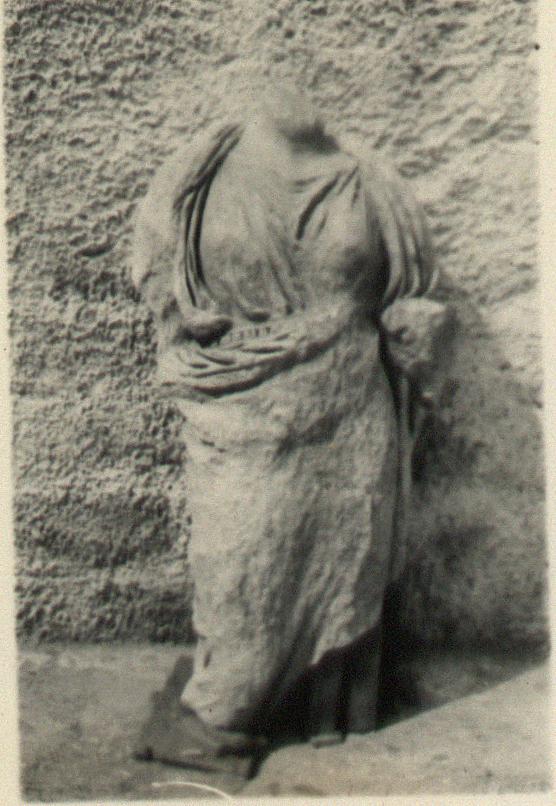 | Description: | The head, legs from the knees, and arms missing. Much worn and battered. Standing female figure, in chiton and himation, somewhat over life-size. Heavy proportions and wrinkles indicated in neck suggest an elderly woman. Pentelic marble. | |