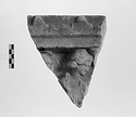 | Description: | A fragment from a grave, or votive, relief. The back is rough-picked; the top edge and surface preserved. The marble has been so stained and damaged by fire that it appears gray on the finished surfaces and pinkish in the breaks. The relief is crowned by a molding consisting of three flat bands, of which the middle one projects and has two antefix-like decorations above it in relief. Below appear the head and shoulders of a female figure, the head in profile facing right, with a downward gaze. Her hair is arranged in a heavy roll round the brows and a large knot at the nape of the neck; she is wearing chiton and himation. Behind her, at the left edge of the fragment, part of the head of another figure, male, also facing to the right. Pleasing subject; undistinguished technique. Pentelic marble. Joins with S 1010 (ΙΙ 257), see photograph in database. | |