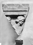 | Description: | A fragment from a grave, or votive, relief. The back is rough-picked; the top edge and surface preserved. The marble has been so stained and damaged by fire that it appears gray on the finished surfaces and pinkish in the breaks. The relief is crowned by a molding consisting of three flat bands, of which the middle one projects and has two antefix-like decorations above it in relief. Below appear the head and shoulders of a female figure, the head in profile facing right, with a downward gaze. Her hair is arranged in a heavy roll round the brows and a large knot at the nape of the neck; she is wearing chiton and himation. Behind her, at the left edge of the fragment, part of the head of another figure, male, also facing to the right. Pleasing subject; undistinguished technique. Pentelic marble. Joins with S 1010 (ΙΙ 257), see photograph in database. | |