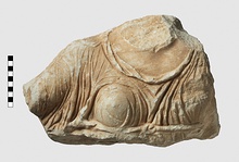 | Description: | Part of a draped female figure, perhaps slightly under life-size, the upper part of the torso only preserved, with some of the upper part of the extended right arm. She wears a sleeved chiton, which is girded up very high under the breasts, and a himation draped across the back just above the break. Back not so carefully finished. Pentelic marble. Cf. Bieber (1955), figs. 264-265 (running Niobid). | |