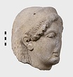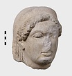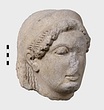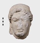 Head of archaic Kore type, about life-size, with a diadem and large stud earrings. The hair escapes from under the diadem in parallel wavy strands ending in two rows of snail curls framing the upper part of the face. On the sides and back, it hangs down long behind the ears in heavy ribbon-like locks. The top of the head, where it is preserved, is slightly but carefully stippled, save for a few shallow locks, which are indicated immediately above the diadem in front.