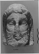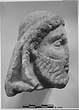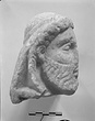 Filleted archaistic small head with beard and mustache. Hair dressed over forehead in two rows of snail curls; one long lock hang down at side behind each ear, and in back it hangs flat in a thick wig-like mass, the hair itself indicated by parallel wavy lines.