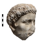 | Description: | Probably from a relief, as flat break at back suggests. Break at right through middle of left eye; chin missing; nose rubbed off; curls chipped in a few places. Head of a youth in half profile to right; double row of snail curls across forehead, wavy locks behind. Carefully finished. Pentelic marble. | |