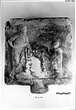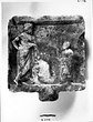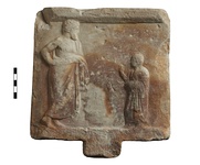 | Description: | Small rectangular plaque bordered above by narrow taenia and splay; below, taenia with tongue at bottom for attaching. Two draped figures; bearded man at left leaning on a staff, at right, facing him, a small figure with right arm upraised. Pentelic marble. | |