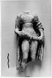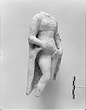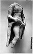 | Description: | Broken off diagonally across the lower legs. The head was made separately and attached with a pin. Back left rough. Hermaphrodite of a type similar to S 1234 (ΝΝ 2578), but more elaborate. The figure wears a high-girt chiton and a heavy cloak, which falls over the shoulders and to the ground at the back. Both hands lift the skirt up to the waist in front. Island (?) marble. Cf. also S 629 (Τ 197) and terracotta types T 1808, T 3002, T 3107. | |