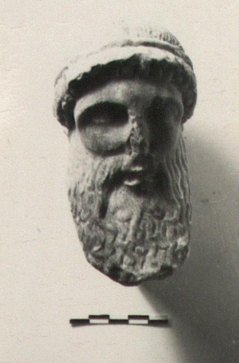 | Description: | A small bearded head, complete save minor chips. Iron dowel with lead for attachment to body (or herm). Hair done in archaic manner; long pointed beard. Pentelic marble. | |