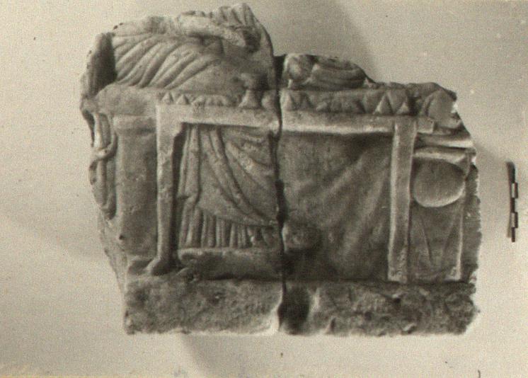 | Description: | Rough-picked back, bottom and right side preserved; broken at top and at left. Preserved is the lower part of a seated figure, right; in front, a sacrificial table with six pyramidal cakes and one round one. At left, part of a snake. Pentelic marble. Cf. S 1229 (ΟΟ 30). | |