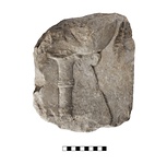 | Description: | Part of the right edge and the rough-picked back surface remain; other edges broken. The stool tapers toward the top, where there is a curving, volute-like projection. This part of the object in very low relief, and superimposed is the leg of the stool, tapering toward the bottom (broken), and surrounded by three narrow rings half way up. A small part of the back of a person, seated upon the stool, remains. Coarse work, surface damaged. Grayish white marble. ADDENDA Also interpreted as a loutrophoros. | |