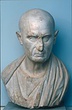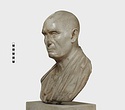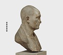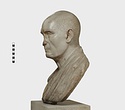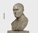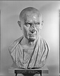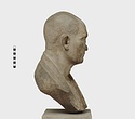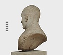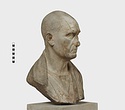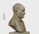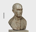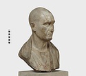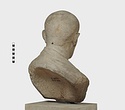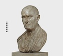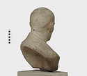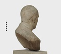 | Description: | Complete except for chipped nose, and base. Draped bust, wearing tunic and cloak. An elderly man; the bald head has a close-clipped fringe of hair; the features are heavily lined. Point of juncture with tongue for base 0.16m. side. The highly crystalline marble has a grayish cast. It had been brought to a high finish on the flesh surface, in contrast with the matte finish of the hair and the drapery. Island marble. Drilled for setting, two holes in lower edge of bust, June 1958. | |