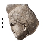 | Description: | Broken at left, right and below. Part of smooth top and rough-picked back preserved. Head of a woman, left, wearing a sakkos, in medium high relief. Probably broken from a grave monument. Pentelic marble. | |