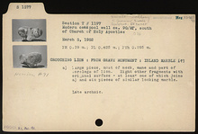| Description: | Crouching lion mended from many pieces. One large piece preserves most of neck, mane and part of forelegs of lion. Eight other fragments with original surface, at least one of which joins, and six pieces of similar looking marble. Late archaic. Island marble. | |