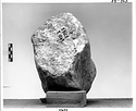 | Description: | From mid part of nude male figure, apparently in the round. Right leg held up, or forward as is seated. Small hole for peg just to left of broken right leg. Much weathered, especially at front. Island marble. | |