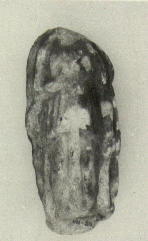 | Description: | Heads missing; bottom somewhat broken, seems to have been cut to fit in socket. The three figures stand with backs together, the line of their extended arms holding out drapery which forms a double frame between them, save in the case of one which has the right arm bent sharply at the elbow. They are dressed in peplum with overfall girt at the waist and hanging below in regular folds. The skirt is done in the style if some of the Acropolis maidens, clinging to the legs and drawn out on either side, with bunched folds hanging down the middle. Indifferent work, much battered. Pentelic marble. | |