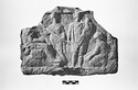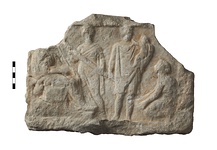 | Description: | Rough-picked back, right side, bottom except for broken tenon and part of top, with cutting above third figure from right, preserved. Four figures, from left to right: seated draped figure right, with scepter in left hand; standing draped woman facing, carrying torch and wearing himation and polos; man with short tunic facing, holding child in left arm; kneeling suppliant, left. Hymettian marble. Cf. Hesperia XVIII (1948), p. 177, S 1251 (ΝΝ 2950). Same subject, identified as Demeter, Kore and possibly Iakchos carrying infant Ploutos. | |