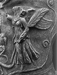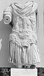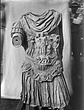 The figure wears kilt, corselet and cloak. The corselet is elaborately decorated in relief: between two Victories, Athena standing on the she-wolf; on the lappets, heads of Zeus Ammon, Apollo (?), elephant's heads and smaller ornamental motifs.