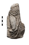 Lower part of torso and right leg (kneeling?) of draped male figure. Part of relief background preserved.