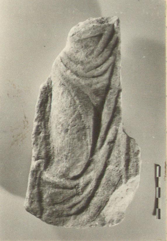 | Description: | Broken all around. Back very rough but possibly original. Lower part of torso and right leg (kneeling?) of draped male figure. Part of relief background preserved. Fair condition. Pentelic marble. | |