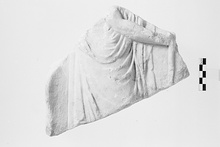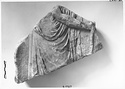 | Description: | Back and part of left edge preserved, otherwise broken all around. In low relief part of a male figure, right, wrapped in himation and holding a staff in his extended right hand. Behind him the background curves out to the edge. Side finished smooth. Back carefully picked. Very careful work. Island marble. | |