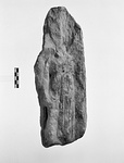 | Description: | Right side of relief, fairly even (seems cut and comes forward a little on front edge). Back rough-picked, convex surface. A little of top surface preserved (?), probably not much missing below. The head of the figure is gone with flaking off of marble above of face; feet missing; left arm not distinguishable. She wears a chiton girt at the waist, and stands with weight on left leg, the slightly bent right clear through the thin drapery. Her right arm hangs at her side. Close beyond it are traces of another standing draped figure. Surface much damaged. Shallow carving. Pentelic marble. | |