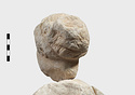 | Description: | A vertical sliver preserving part of right shoulder and right arm of female figure, half life-size, in high relief. Seems to have split off at line of junction with background and line of junction of arm with body. Both lines suggest a quietly standing pose. Below the elbow the arm seems to have been cut free, and there are unsmoothed traces of a large drill cutting up and in toward the background. Ancient weathering on top of shoulder and along arm near background. Front of arm has a grayish granular surface (marble-pile weathering?). The figure wears a thin chiton, fastened at four points, which has slipped down off the shoulder. Scale and workmanship similar to Altar of Ares figures. Pentelic marble. Joined to S 2024 (ΕΛ 1). | |