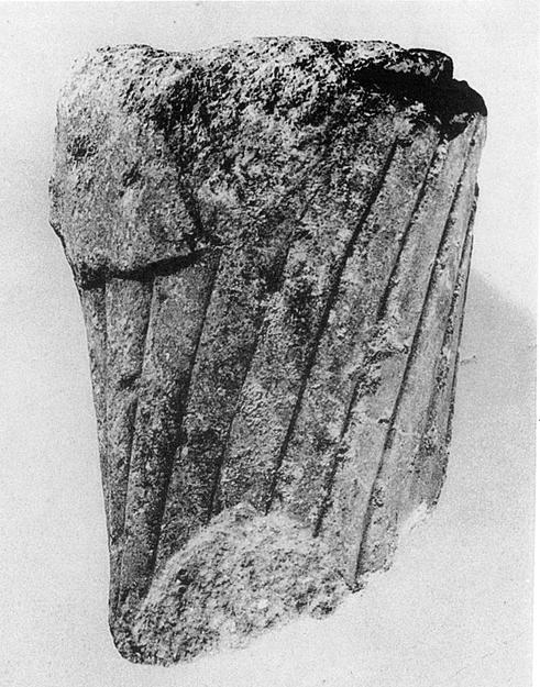 | Description: | Broken all around. Flat folds (of chiton?) converging upward in front and downward in back, below a thicker garment (himation?) with wavy surface. Perhaps from the right thigh of a small kore. Island marble. | |