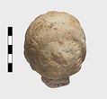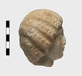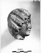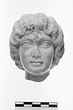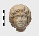 | Description: | Broken off at neck; nose and chin chipped. Chignon at back looks purposely cut away. Hair parted in center, falls in broad waves covering ears and is gathered into a knot low in back. Wisps on forehead in center. Large eyes, narrow-bridged nose and curved mouth resemble features of Julia Domna, of whom this is probably a portrait. Pentelic marble. | |