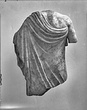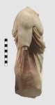 | Description: | Draped male figure (Asklepios), about one-third life-size, wearing himation which frames chest, falls lightly over legs and heavily over left arm and down left side. Right arm broken at biceps. Stub of staff preserved under right arm. Traces of bright red paint preserved on right side and back of garment and in folds. Burnt traces on left edge. White marble. Mended with S 1067. | |