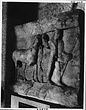 Archaistic relief. Bearded man with long hair, carrying chlamys on right arm and spear. Moves right leading pair of horses whose heads are in high relief. Very broad borders.