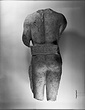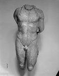 | Description: | Head, arms and legs missing. Drapery at sides broken off. Nude youthful male figure perhaps copied from a late archaic kouros. Long tresses on shoulders. A small mantle passed across the back above the hips and hung down the sides. It is rendered with very stiff, straight folds. Archaistic. Represents perhaps Dionysos. Pentelic marble. Cf. S 308 (Θ 618), small statuette of Dionysos in similar style. | |