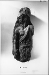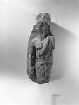 Medium relief. Draped standing male figure, perhaps Hephaistos, preserved from head to knees; left arm broken off below shoulder; face badly battered. Head apparently slightly tilted and turned to own right. Short thick hair; possibly traces of beard; heavy muscles on neck, arm and chest. Garment covers left shoulder, leaving right arm and chest bare; wide belt at waist. Right arm at side holding object.