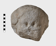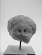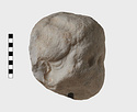| Description: | Upper part of much damaged head, over life-size. Back of head broken away. Remains of close set eyes and upper part of nose; spreading ears. Front hair waved, bordered at brow by row of flat ringlets. Pentelic marble. Drilled for setting on base 1950. | |
