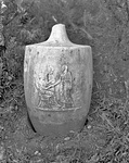 In relief three figures. Seated woman with standing woman beside her shakes hands with standing man.