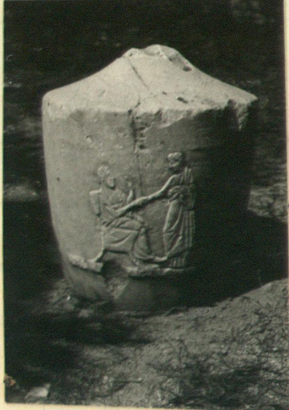 | Description: | Neck and handle broken off. Foot missing. In relief, two figures. Seated man shakes hands with standing woman. White marble. | |