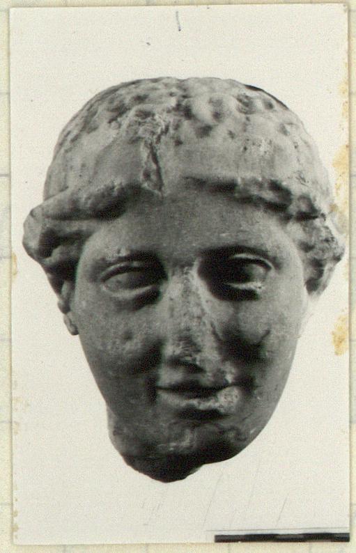 | Description: | Broken at neck. Part of nose missing. Small chips from lips and chin missing. Head slightly tilted to her right. Lips parted in smile with teeth showing. Holes in earlobes for earrings. Hair parted at center and gathered at nape of neck. Fillet binds hair. Top surface of head much weathered. Temple of Ares Frieze. Pentelic marble. | |