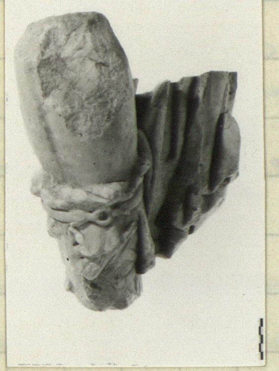 | Description: | Broken above and below. Large fragment of a left leg from below knee to above ankle of a male figure. He wears high hunting boots composed in parts of a panther skin with head and paw visible. Drapery falls down on left side of leg. Back of drapery cut to a flat surface, rough-picked, suggesting the piece as a whole being from a relief. Crystalline white marble. | |