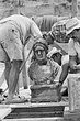 Long strands of hair, parted in middle, pulled down and back over ears. Hair in back bound in a thick coil. She wears a thick fillet tied at the back, and a wreath. Eyebrows defined with lightly incised strokes; frown lines between brows. Large drilled pupils. Dimpled chin. Deep broad lines below eyes and around mouth. Thick neck, receding chin. Light undergarment with heavier wrap over shoulders, tied in front. Large molded base. No inscription. Face and neck somewhat polished.