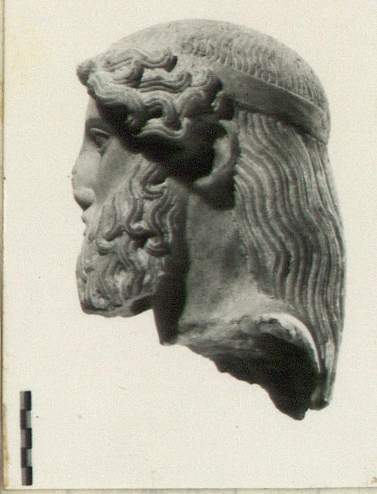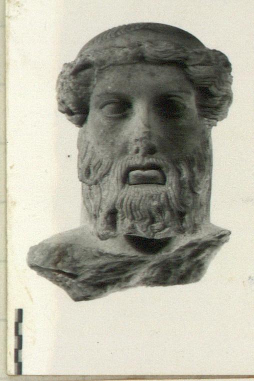 | Description: | Broken at neck, preserving part of socket of right arm. Tip of nose broken. Lower lip replaced, probably ancient repair during carving. Bearded. Long hair in waves from face and circulating from crown long in back. Stephane held with thin cord at back. Large crystal white marble. | |